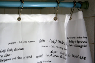 I found this shower curtain (brand new in the package) at a yard sale a couple of weeks ago. It is the Top 100 SAT words and definitions and it is a blatant display of my nerd-ery.