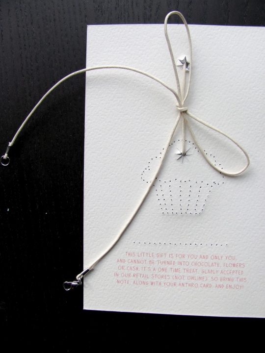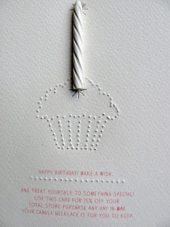 Anthropologie makes me throw up in my mouth with their freakin' cuteness. I opened my usually mundane pile of mail today to find a birthday card from Anthropologie, good for 15% off any purchases made in July. The candle atop the cupcake is actually the pendant for the attached necklace. Commence drooling.