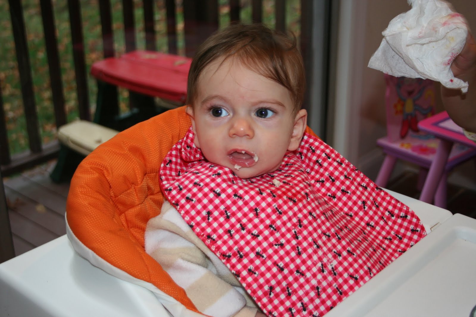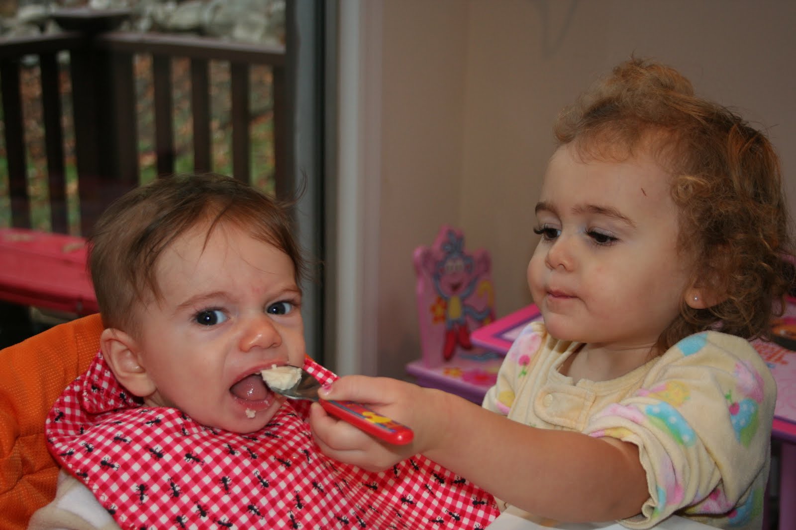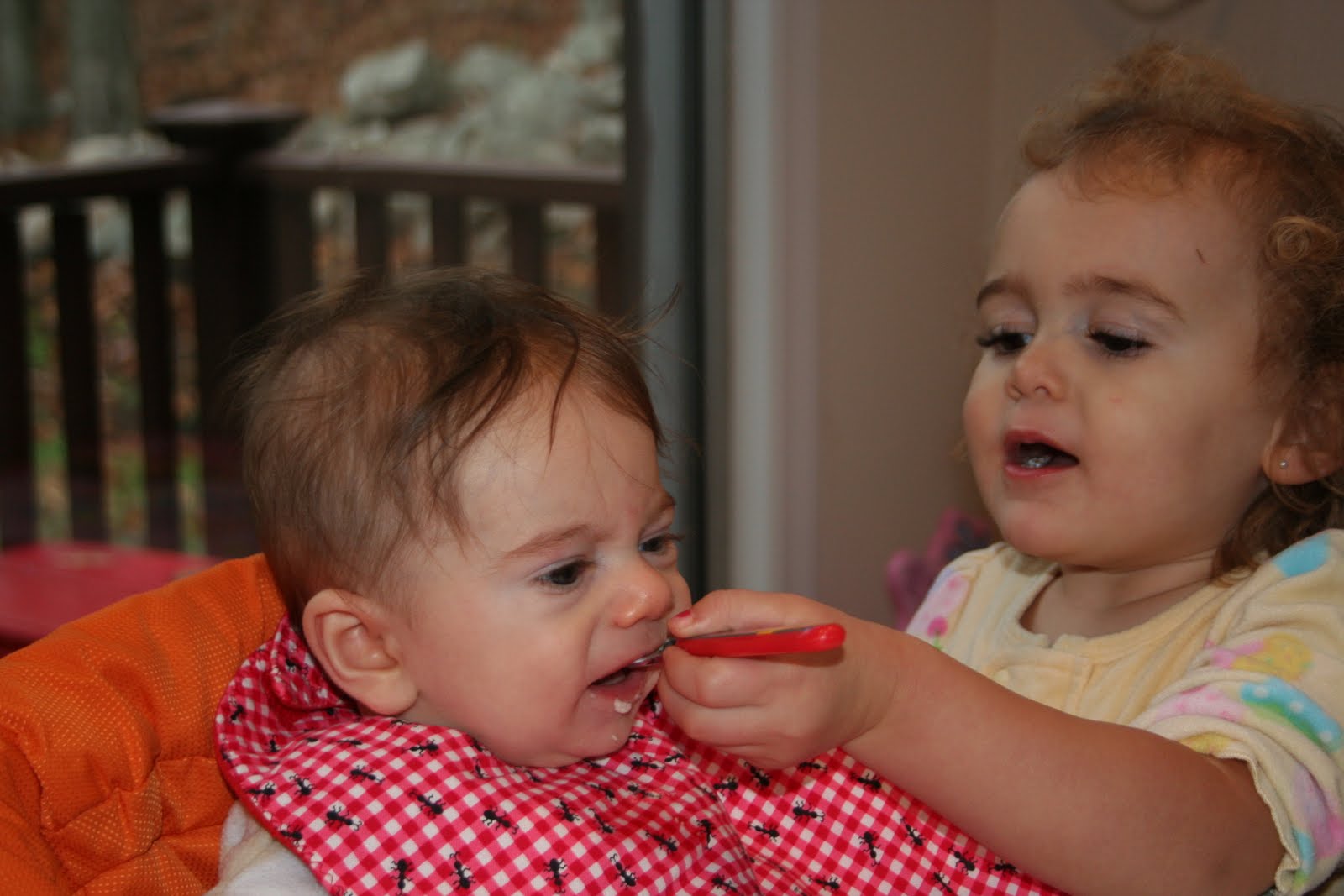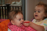 So we jumped into solids on Saturday. Beatrice was very much into helping out (of course.) She gave him his inaugural first bite. I love how she's such a little mama. Check out how her mouth is open, mimicking his open mouth.