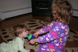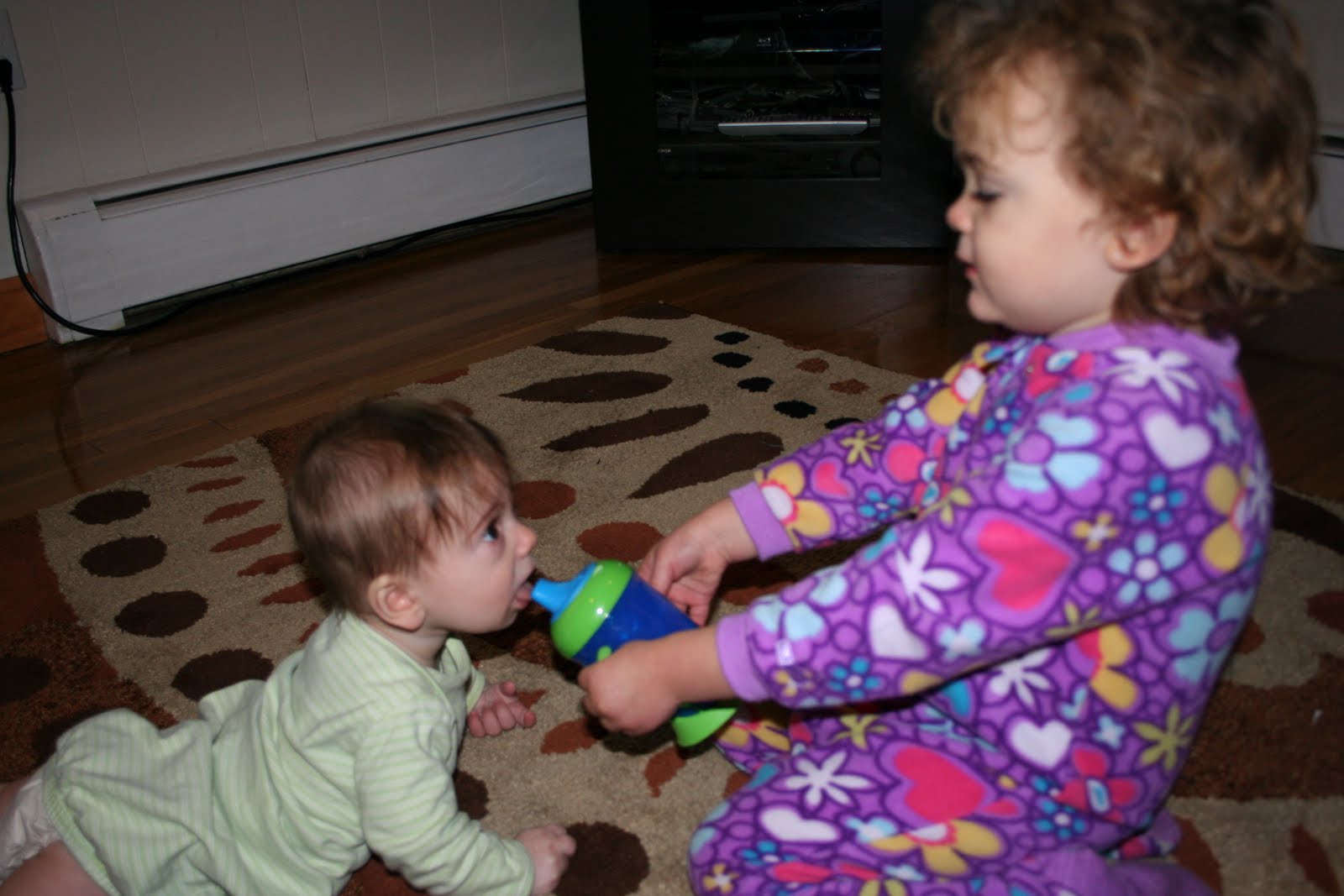 Beatrice (shrieking): "Dora Christmas special, Dora Christmas special. I haven't seen in foreber (forever)." (Note that Beatrice's head is completely turned away from Theo, she's totally missing his mouth with the cup.)