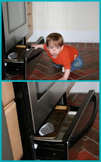 Your latest favorite past time includes playing with the oven tray (and hiding your shoes in there.)