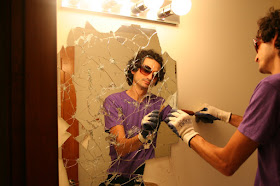 Then we brought in Cory's uncle to paint the wood trim white and add wallpaper. We put up a new mirror and light. For the mirror, I used one that my sister bought me at her co-worker's yard sale ($5). I repainted the gold trim a coral color. I couldn't find the exact light I wanted so I went with this cheap one from Lowe's in the meantime. (Although I am oddly drawn to the globe 70s bulbs.) Here it is.