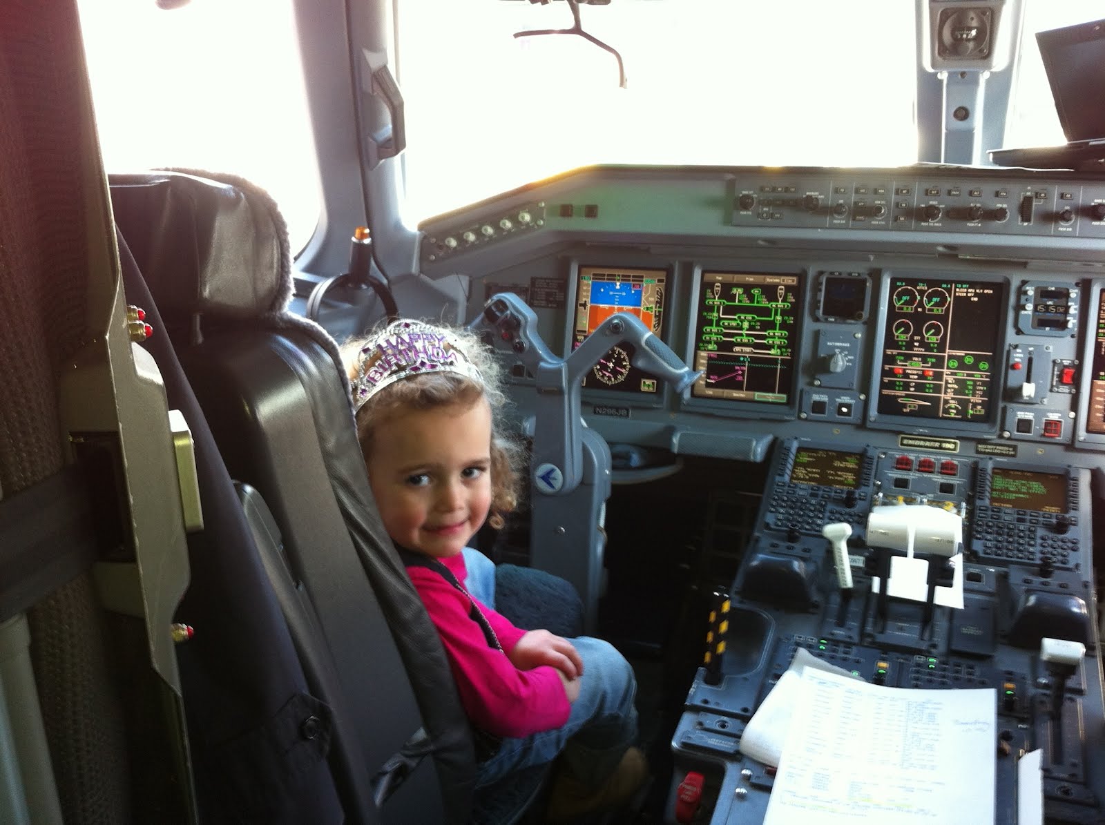 While we were in Virginia this past week, my sister threw an early birthday party for Beatrice since she won't be with us on Beatrice's actual birthday. She gave Beatrice a Birthday Princess crown that she wore the duration of the trip. On our way back home, while boarding the airplane the flight attendant noticed her crown and informed us that Birthday Princesses get to sit in the cockpit. The pilot jumped out of his seat and ushered her into the pilot's seat. So much for TSA security in our nation's capital!
